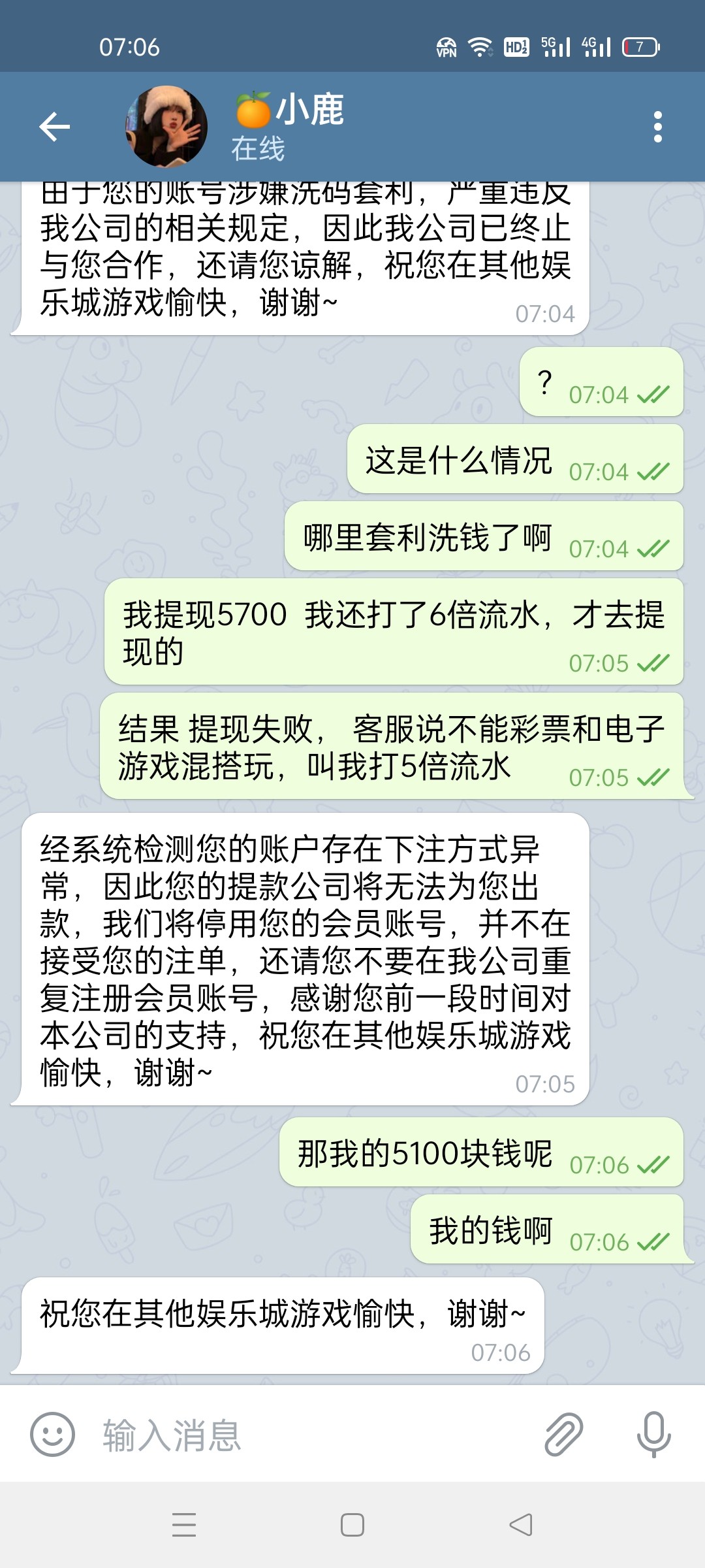 事情是这样的,我今天上了4000   然后打快三 打到5600   然后玩财神打鱼 打了2万的水(因为要3杯流水提现) 然后提现,第一次提现失败,提示联系客服,  我找客服了  客服理由是我不能同时玩快三和pg电子游戏,然后让我重新玩出款的5倍流水,我只玩一个游戏 一飞冲天, 等我打完5倍流水  38000多流水 满足了,我问客服 可以提现吗? 客服说可以,但我提现之后 2分钟不到就给我封号了,钱也被扣除了,然后找客服 无限被拉黑 一句话也不理你,直接拉黑聊天窗口 封ip!